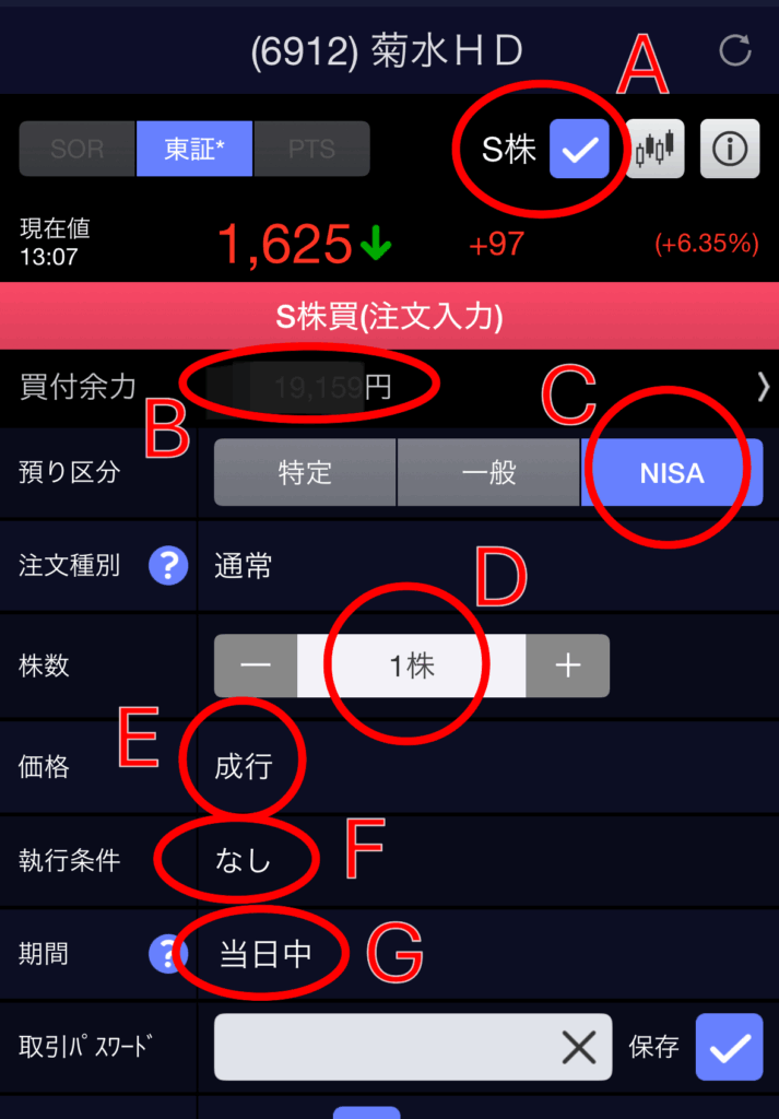 ②各種設定画面 - 株数: 購入したい株数。「S株」などで1株単位で購入する場合は「1」を入力します。