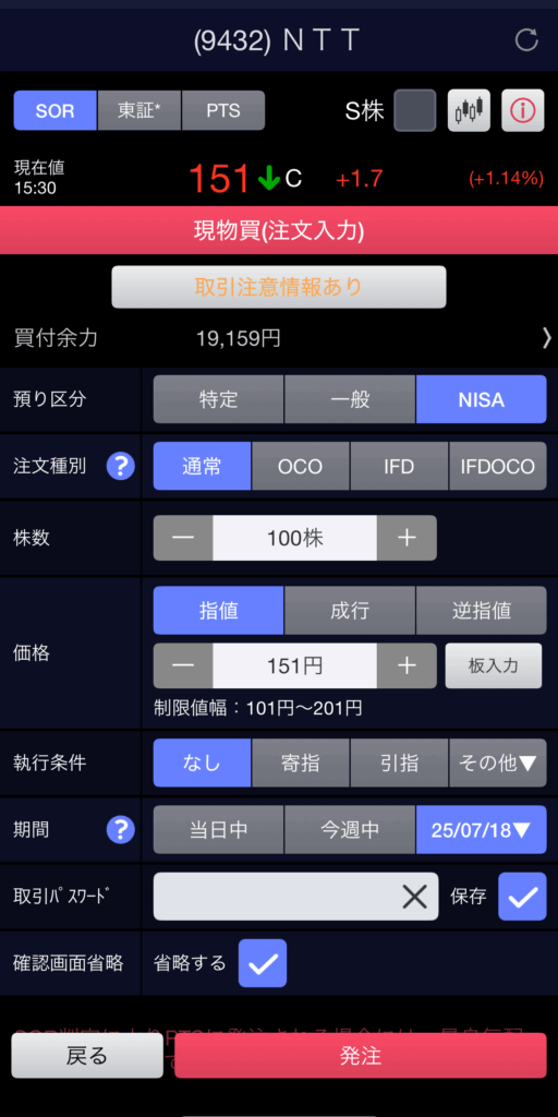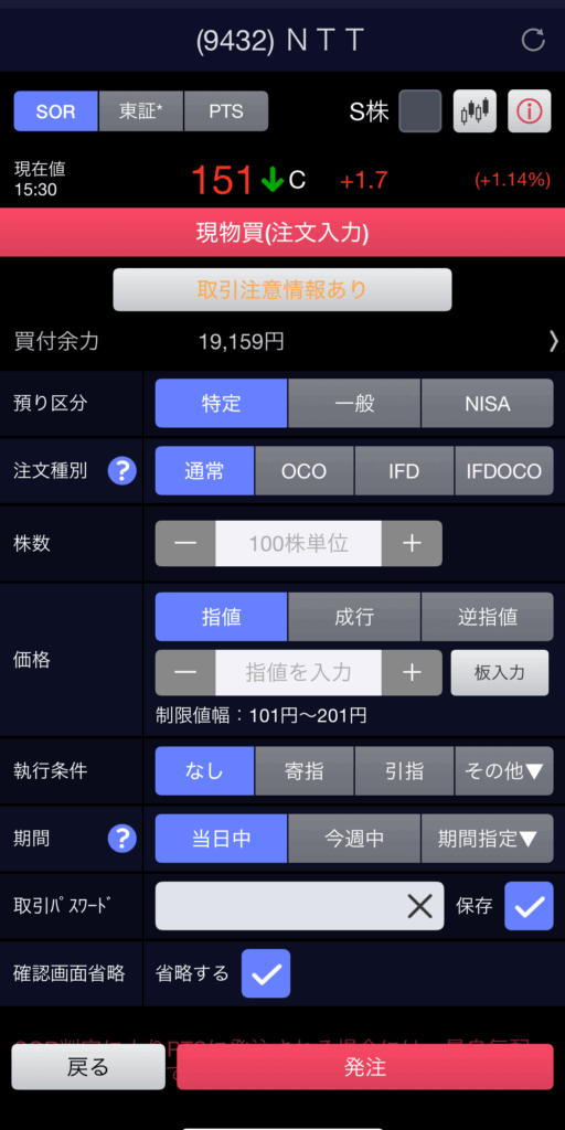 - 執行条件: (指値の場合に選択肢が出ることが多いです)なし、寄付、引けなど。最初は「なし」でOK。