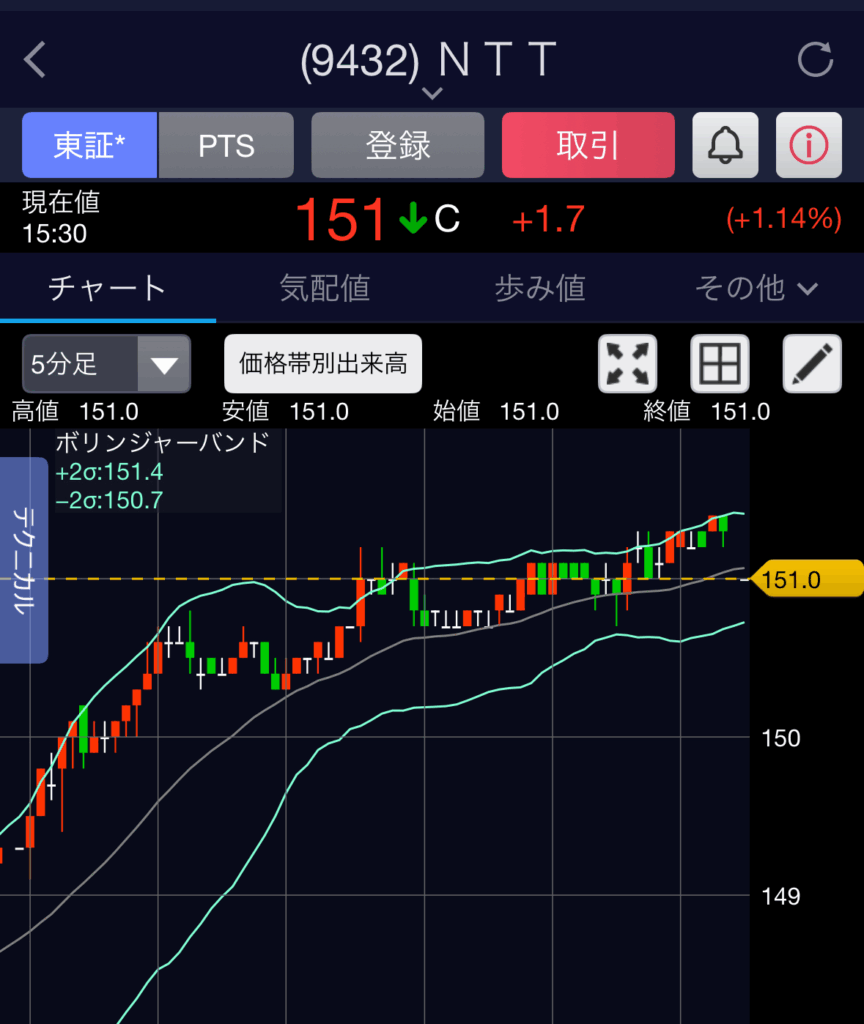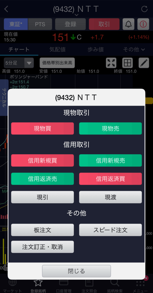 アプリ内の検索窓に、選んだ銘柄の銘柄コード(例: 9432 NTT)または会社名を入力して検索します。※すでに銘柄が登録してあればそこからですね。