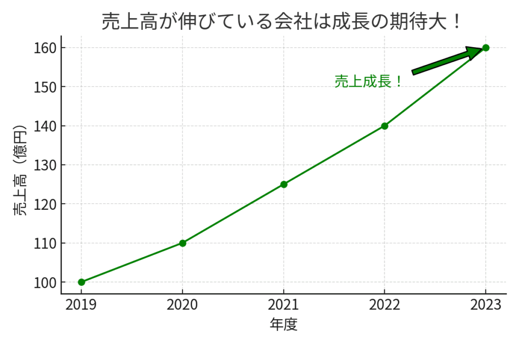 • 過去3~5年の推移: 売上が年々増えている(右肩上がり)会社は、その商品やサービスが世の中で求められ、企業が成長している可能性が高いと判断できます。