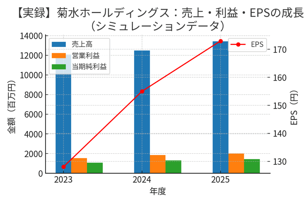 • 売上高・利益の成長: 上のシミュレーションデータを見ると、売上高、営業利益、当期純利益ともに右肩上がりに伸びていることが分かります。これは、菊水ホールディングスの事業が着実に成長しているサインと見て取れます。