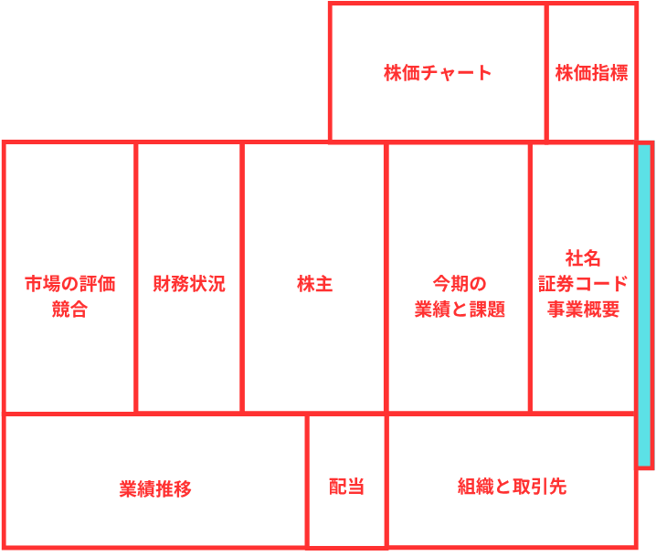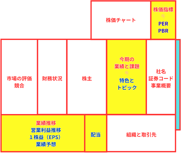 1つの会社に対する記事構成は決まっていて、だいたい10項目程度に分けられます。